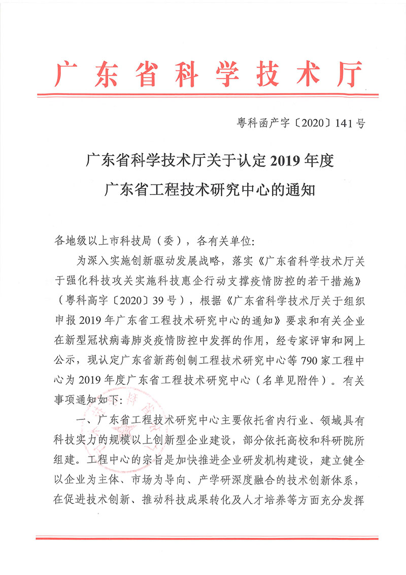 于2019年认定为广东省工程技术研究中心